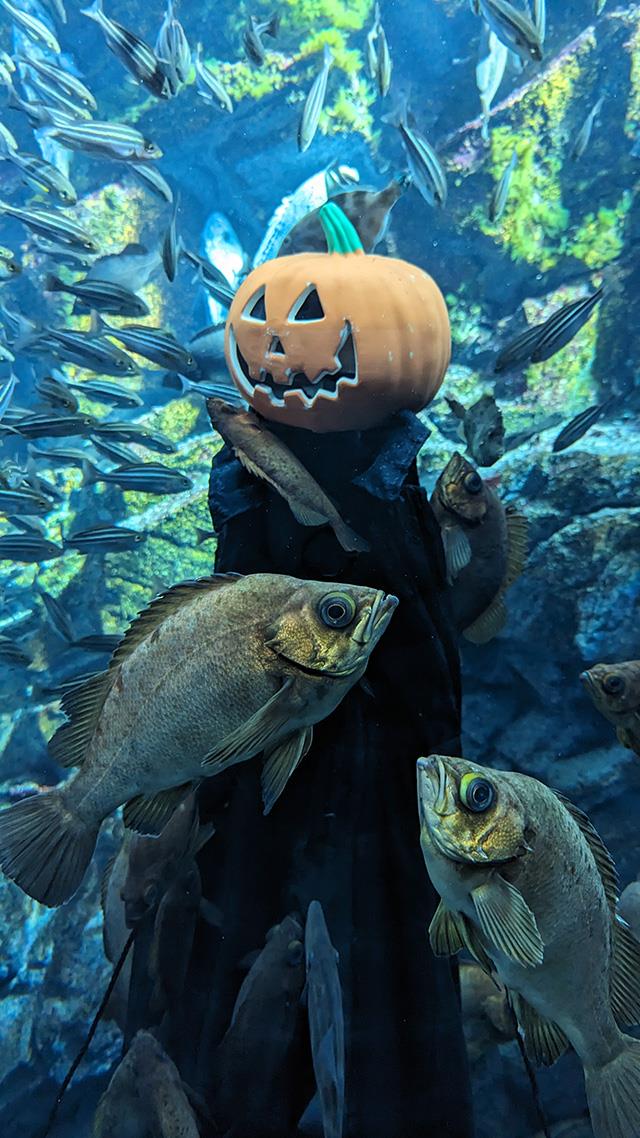 ハロウィンの時期とあってカボチャマンが魚礁となっていました。見事に魚たちの中に溶け込んでいますねえ。